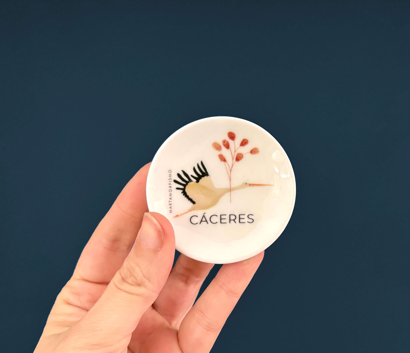 Imán de porcelana tipo platito de 5cm de diámetro con el diseño de la cigüeña. Porque Cáceres también se merece...